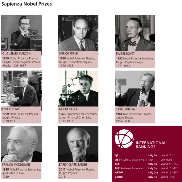 罗马第一大学由教皇博尼费斯八世(Boniface VIII)创建于1303年,是世界上最古老的大学之一。罗马第一大学科学研究活动涵盖的学科范围极广,在许多领域都达到了卓越水平。在最新出炉的QS世界大学学科排名2021年榜单中,其古典学位居世界第一,考古学排名第10位、天体物理学排名第41位、现代语言学排名第55位、护理学排名第65位等。其中,与我院深度合作的罗马第一大学法学院以总成绩72.2分排在全球第58位。毕业于罗马第一大学法学院的Franco Modigliani教授曾荣获1985年诺贝尔经济学奖。