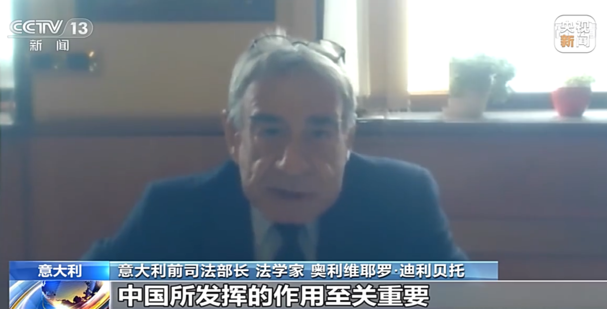 中意学院意方院长、意大利前司法部长、罗马第一大学法学院院长奥利维耶罗•迪利贝托教授接受央视新闻总台采访,高度评价习近平主席在中华人民共和国恢复联合国合法席位50周年纪念会议上的重要讲话。迪利贝托教授指出,人类命运是共同的。各国只有加强合作,深入交流信息,共促拯救生命的救治方案才能战胜疫情,只有团结国际社会才助于各国人民的福祉。在关于合作、友好、和平的政策中,中国无疑发挥了至关重要的作用。