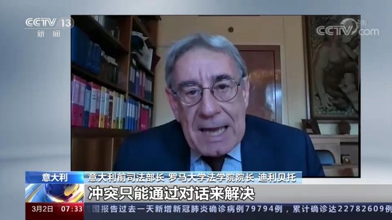 3月1日,针对俄乌局势,迪利贝托教授接受央视记者采访称,自乌克兰危机爆发以来,中国坚定主张尊重和保障各国的主权和领土完整。他十分赞同中方的立场,认为中国政府的表态是公正客观的,中国强调维护所有国家的领土完整这一个客观理性的立场。