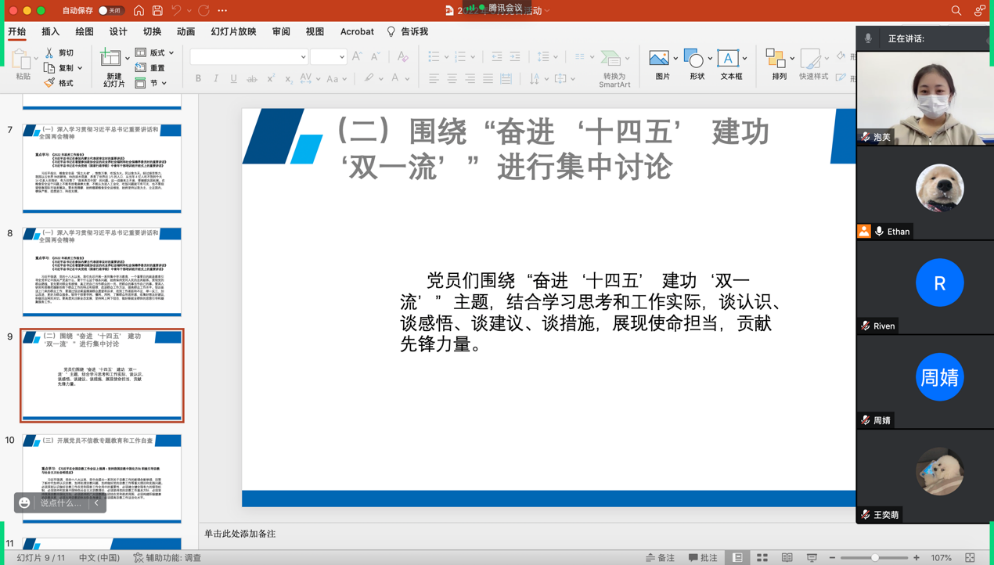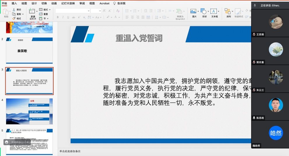2022年3月17日,中意学院党支部在文澴楼625教室及线上召开以“奋进‘十四五’建功‘双一流’”为主题的党日活动,中意党支部15位党员及预备党员参加了此次活动,活动由李恒昊同学主持。