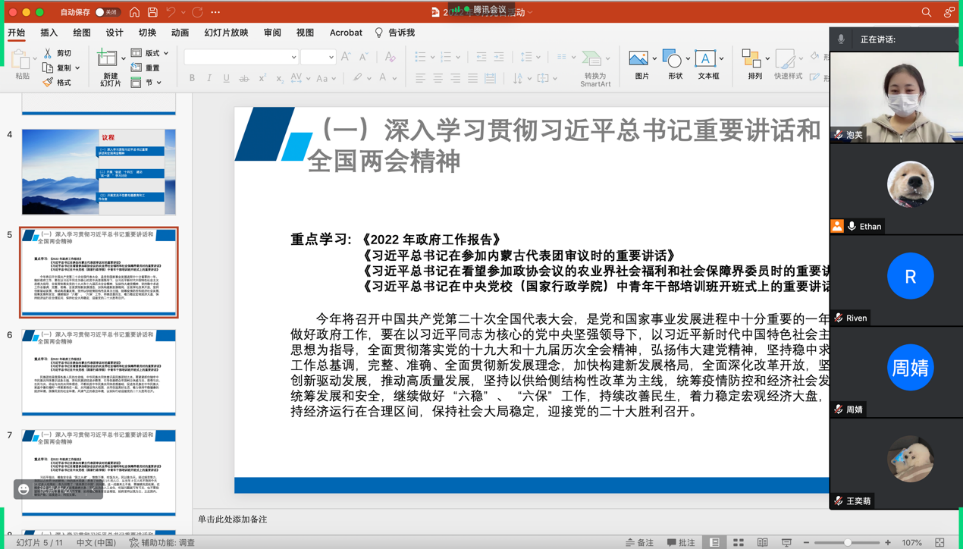 在此次党日活动中,首先由与会党员集体奏唱国歌,重温入党誓词,诵读党章。随后,中意支部开展集体学习,主要包括学习《2022年政府工作报告》《习近平总书记在参加内蒙古代表团审议时的重要讲话》《习近平总书记在看望参加政协会议的农业界社会福利和社会保障界委员时的重要讲话》《习近平总书记在中央党校(国家行政学院)中青年干部培训班开班式上的重要讲话》等。通过对这些文件的学习,党员同志们对习近平总书记重要讲话和全国两会精神有了更加深入的学习,对学校“十四五”战略规划和“双一流”建设方案领会更加深刻。
