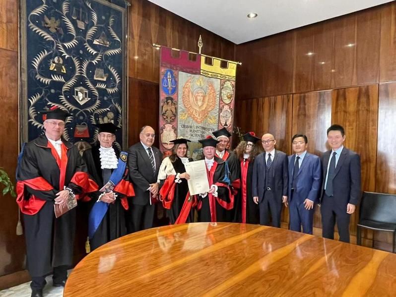 仪式最后,安东尼拉·波利梅尼、杨灿明与学位委员会成员起立并佩戴学位帽,同时安东尼拉·波利梅尼向杨灿明颁发荣誉博士学位证书。杨灿明成为第一位被授予罗马一大“罗马法、制度理论与市场私法”荣誉博士学位的中国学者,充分体现了罗马一大对其学术地位和长期为中意教育和人文交流所作贡献的肯定。