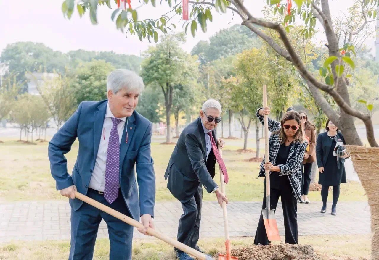 在友谊林,两位校长共同挥锹培土,种下一棵象征友谊、寓意美好未来的桂花树。