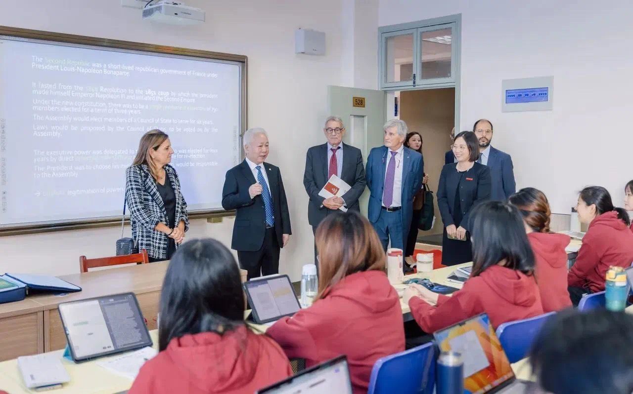 杨灿明等陪同Antonella Polimeni一行走进“比较法与欧洲法”专业课堂与正在授课的罗马一大教师和同学们进行了亲切交流;共同观看了两校合作办学成果展和湖畔音乐会,领略中南大丰富的校园文化生活和中南学子青春昂扬的精神风貌。