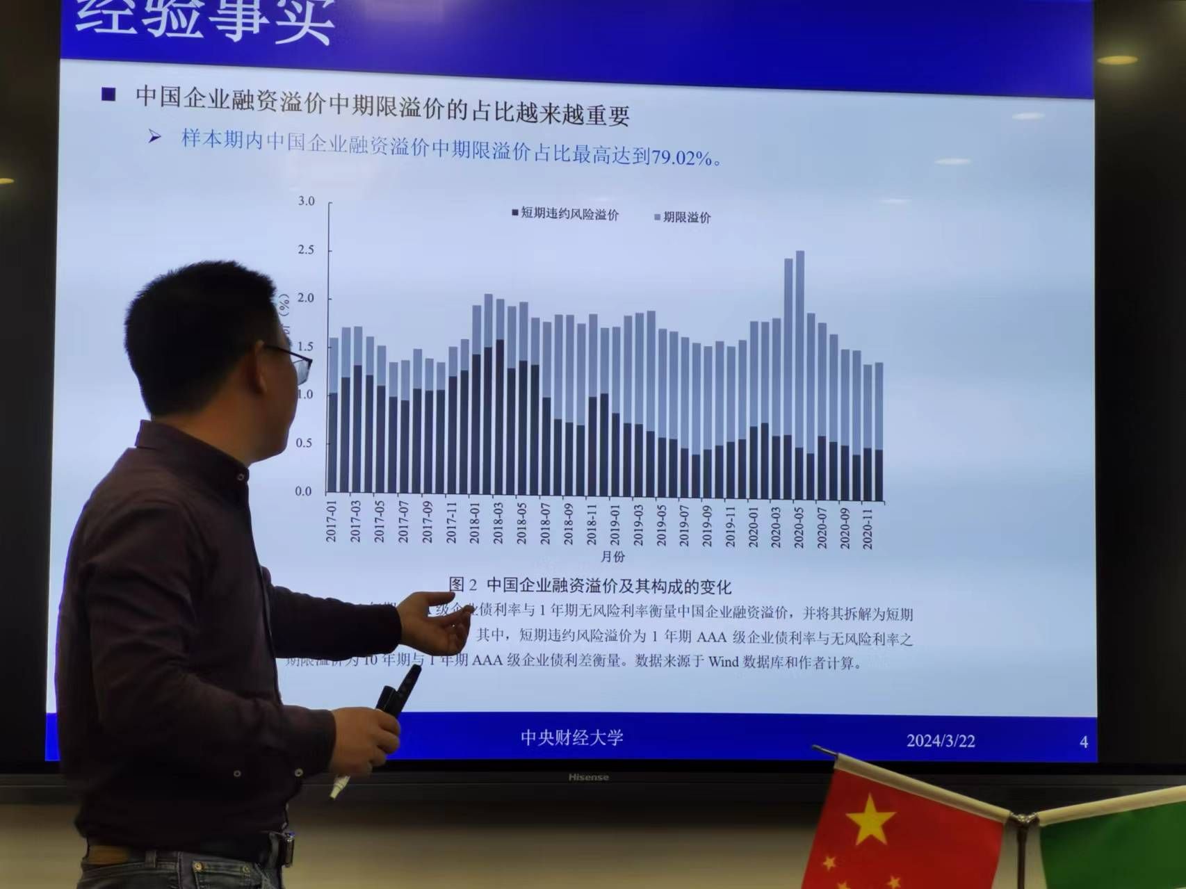 梅冬州教授首先对新兴市场经济体的跨境资本流动特征进行分析阐述研究动机,新兴市场体的企业借入的是长期贷款,然而流入往往是短期资本,这样就会产生期限错配问题。基于中国的经验事实分析,梅冬州教授发现,中国企业融资成本中期限溢价占比越来越重要,但中国的政策利率对企业融资成本影响有限,而美国政策利率与中国企业期限溢价高度相关。在此,洪嘉阳教授与梅教授讨论了美国政策利率的测度问题。基于此,梅冬州教授首先基于Proxy SVAR模型实证检验美国货币政策对中国企业债期限溢价以及经济活动的影响。其次,梅冬州教授通过对企业投资利差进行分解,引入企业融资成本中的期限溢价,构建了一个包含金融摩擦的多部门小国开放经济模型。本模型重点关注金融中介的存贷行为,充分刻画期限错配特征。结论表明,美国货币政策通过影响中国跨境资本流动,进而影响中国企业债期限溢价和融资成本,最终影响宏观经济。