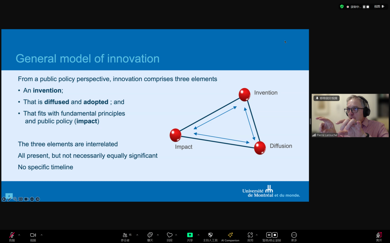 Pierre Larouche教授在讲座中延续了之前的讨论,将不同学科对创新的理解进行整合,并介绍了由发明(Invention)、传播(Diffusion/Adoption)、以及影响(Impact)组成的创新三角模型(The Triangular Model of Innovation)。他强调这些要素在时间上可能不遵循固定顺序,例如在医药领域,对发明影响的评估往往早于其传播和采纳。