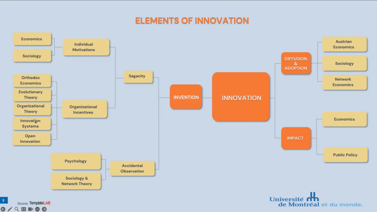 深入探讨发明概念时,Larouche教授阐明这不仅仅是基于现有知识的渐进式发展(learning-by-doing),而是超越。他通过多个实例展示了在科技、流程、营销及组织架构方面的创新,并讨论了产生发明的复杂性。教授认为,发明的产生不仅涉及个人和组织动机(Sagacity),还包括偶然观察(Accidental Observation),可能受到心理学、社会学和网络理论的影响。