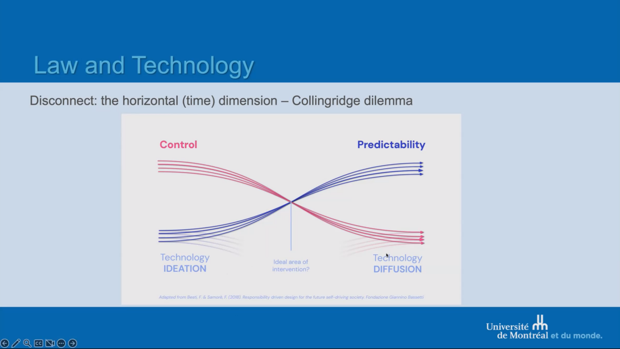 接下来,Larouche教授详细介绍了“法律与技术(law and technology)”流派。该流派视科技和创新为外生现象(exogenous phenomenon),关注创新三角模型中的“影响(impact)”部分,致力于确保科技和创新产生积极的影响。在法律对科技的规制过程中,我们常面临监管空白或缺口(regulatory void or gap)。教授强调,当涉及新兴科技如人工智能时,不应仅将其视为一个被动的管控对象。