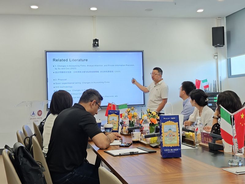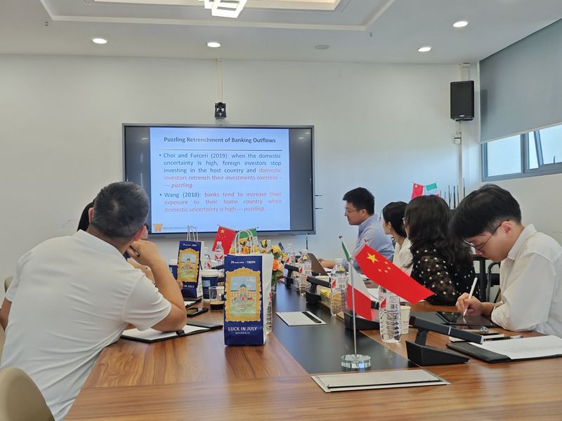 会议伊始,曾松林副教授对到场的嘉宾和观众表示热烈欢迎,对VIC NAIKER教授和蒋理可副教授对于本次讲座的指导表示感谢,并率先展开本次研讨,介绍了近期以国际资本流动为主题的研究热点和研究方向。随后,黄赛男副教授以文献为切入点,从研究动机、研究模型、研究结论等方面详细分析了自己及团队对于银行跨境资本流动的最新发现和最新成果。张美扬老师同样以一篇题为“More haste,less speed?Accelerate patent review with sacrificing quality”的文章,探讨了在数字智能时代专利审查的速度和质量之间的关系。VIC NAIKER教授和蒋理可副教授认真听取三位汇报者的分享,并积极参与讨论,从研究背景、研究结果等多方面给出宝贵的意见和建议。