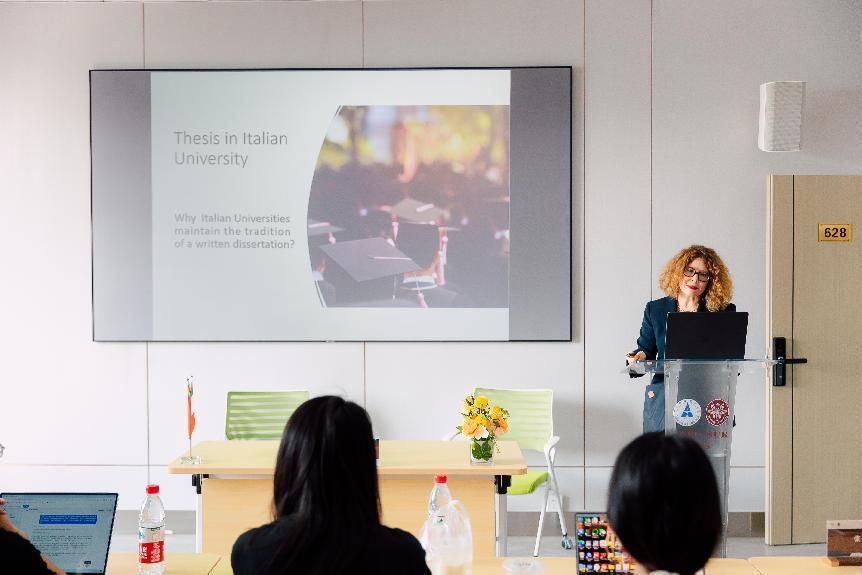 签约仪式后,Ines Ciolli教授做题为“Thesis in Sapienza University”的主题讲座,详细介绍了意大利高校特别是罗马第一大学对学科论文、毕业论文写作的具体要求、写作逻辑与方法、可参考资源等内容。与会师生踊跃提问并就论文选题、文献综述等具体问题进行了积极探讨。