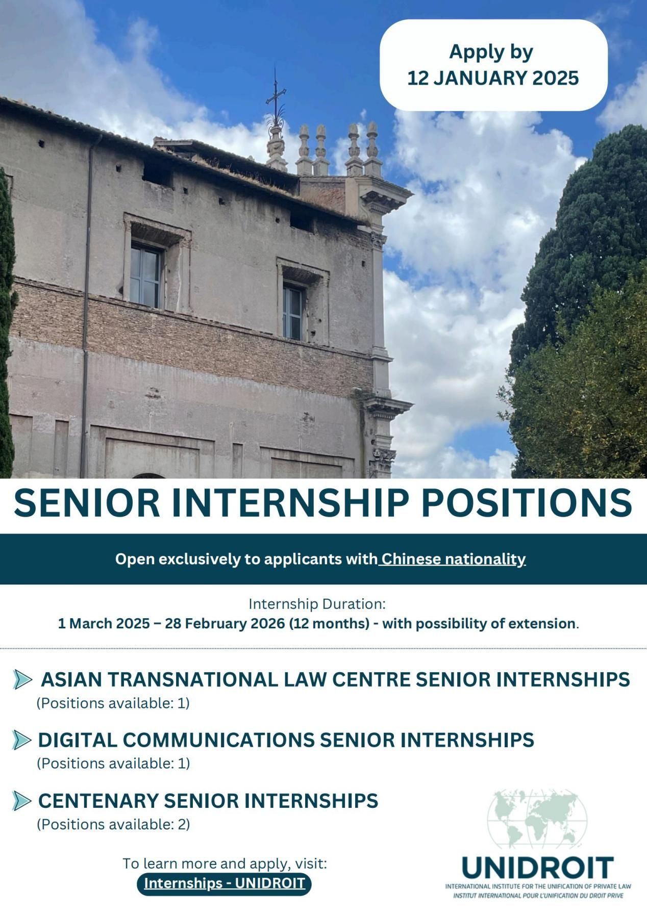 请按照国际统一私法协会岗位描述及申请条件中的具体要求将申请材料(含Cover Letter, CV以及References)于2025年1月12日前发送至internships@unidroit.org