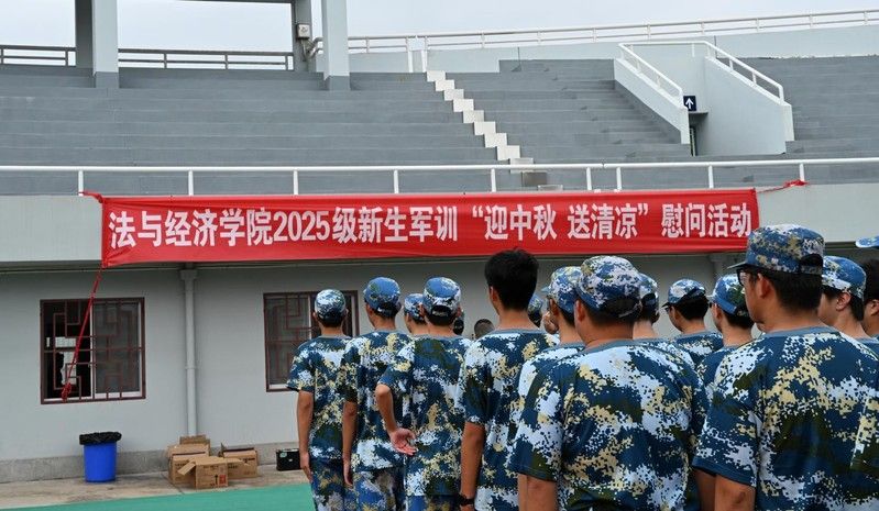 9月23日下午,法与经济学院党委书记周俊杰、院长李俊、副院长黄赛男带队前往南湖体育场看望全体参训新生及承训教官,开展了“迎中秋 送清凉”慰问活动。学院党政办公室、学生工作办公室及学生党支部代表参加了此次活动。