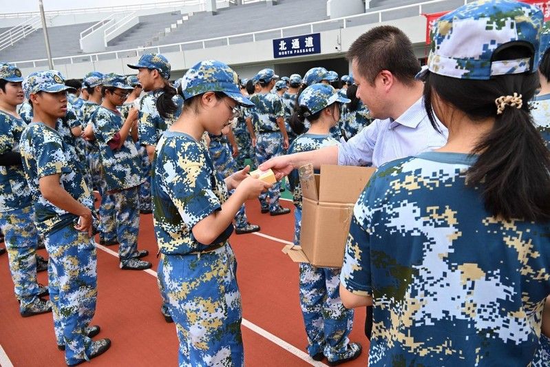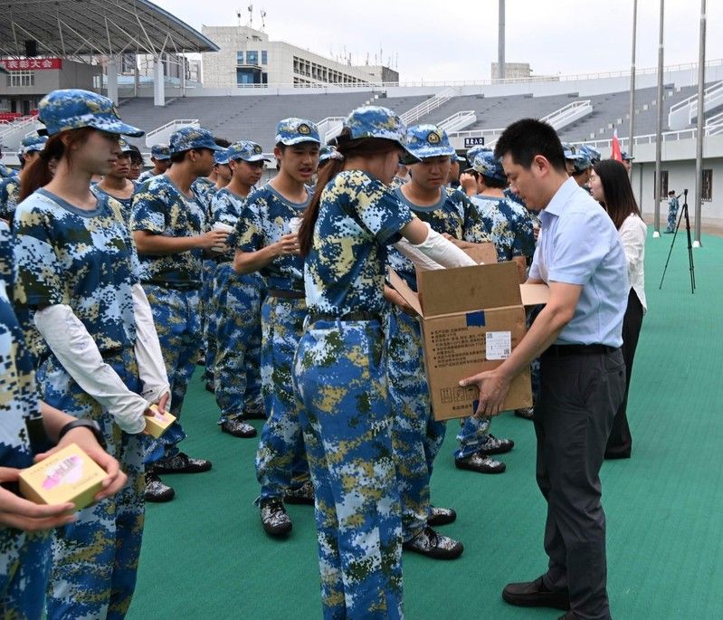 随后,学院领导老师们亲手将精心准备的清凉饮品、特色文创月饼等慰问品逐一发给同学们,并叮嘱大家要劳逸结合,注意个人健康,同时要求相关部门和带训教师务必加强后勤保障,密切关注学生身体状况,确保训练安全。
