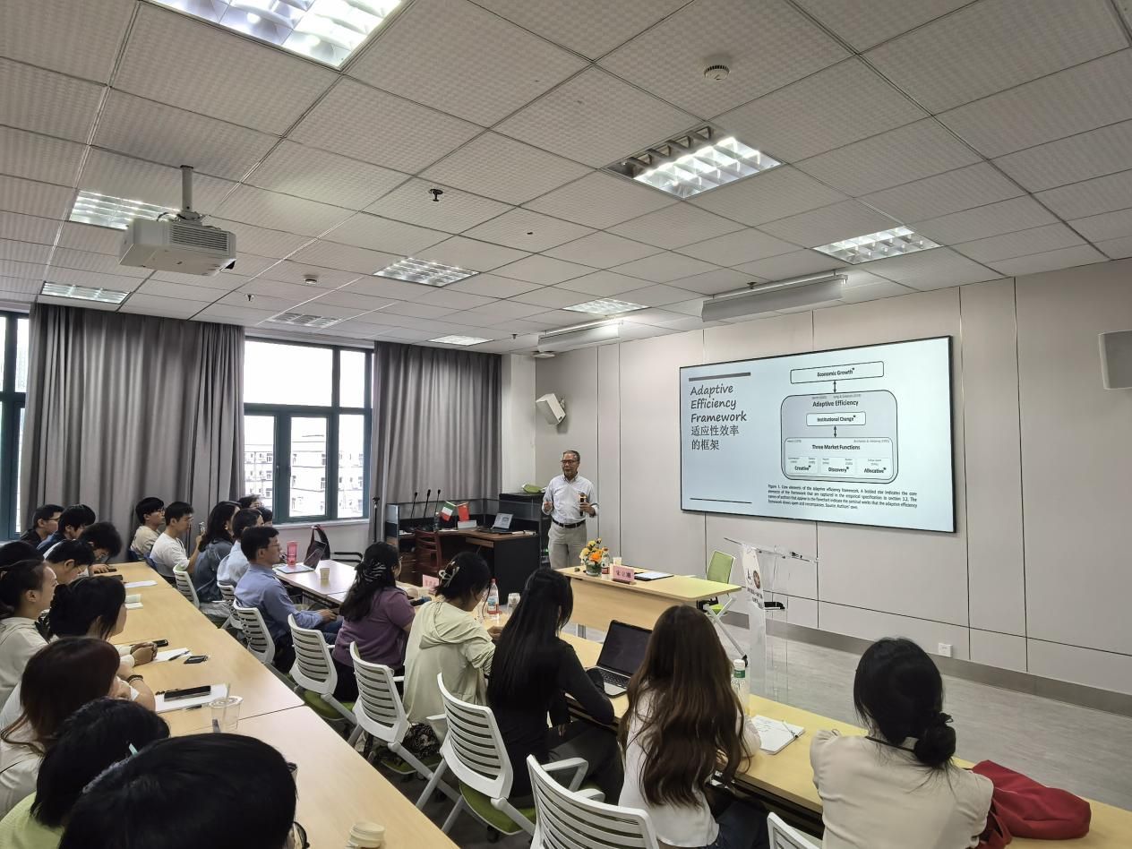 黄赛男对宋立刚教授以及到场的嘉宾和同学表示热烈欢迎,介绍本场讲座的背景、框架与主题。宋立刚教授以“适应性效率”为核心分析框架,结合诺贝尔经济学奖得主道格拉斯·诺斯与詹姆斯·布坎南的理论,提出了融合“市场三大功能”,即配置功能、发现功能与创造性功能的新型制度经济学视角。他指出,中国四十多年的经济转型是一个动态、非线性的过程,传统新古典经济学难以全面解释,而制度经济学因其强调制度内生变化与学习认知的作用,更能贴近中国改革的实际。