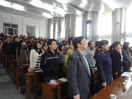 在院组织员朱冬生老师的主持下,全体起立,高唱国歌。延承着十八大的光辉,我院分党校第十二期培训班正式开班。