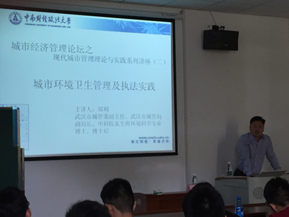 10月14日下午两点,城市经济管理论坛之现代城市管理理论与实践系列讲座第二期特邀了武汉市城管委副主任、武汉市城管执法局副局长郑利博士,在文泉北208为城市与经济管理系的师生讲解了武汉城管委的管理及执法实践。