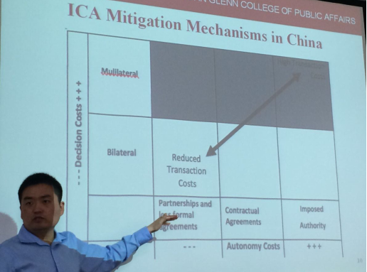 第二阶段易洪涛教授为我们带来了中国地方政府雾霾治理政策形成因素研究的报告。易教授以科斯的交易成本理论和制度集体行动模型为基础,将各类合作作为因变量,通过对各城市经济、城市等级、交易成本、合作数量、历史环境等因素的探究,得出各类府际合作形式产生的动力所在。报告结束后,与会的老师、学生就报告内容与两位教授进行了深入交流。