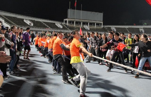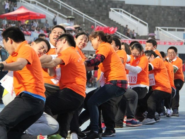 10月21日下午5点半左右,拔河比赛在万众瞩目下拉开帷幕。作为本次运动会的最后一个项目,也是最能体现集体凝聚力和团体协作能力的项目,拔河比赛吸引了无数观众围观。拔河比赛采用三局两胜制,获胜的队伍方有资格参加下一轮角逐。第一场公共管理学院对阵会计学院,只见运动员们陆续入场,他们摩拳擦掌,跃跃欲试,等待着在接下来的比赛中大显身手。观众们也全神贯注,目不转睛,攥紧了拳头,万分期待作为压轴的拔河比赛,裁判员一声“准备”且双手平举示意双方运动员比赛即将开始。哨声一响,现场气氛热烈,加油声、击鼓声、口号声,声声入耳。运动员们身体全体后倾,呈不可撼动之势,“一二、一二、一二”强有力的节奏伴随着运动员们的律动,中间的红线渐渐靠近我方,加油声也愈发响亮,运动员们气势如虹。在红线拉过我方白线的那一刹那,全场运动员和观众欢呼雀跃,“威武公管,逐鹿中南,气宇轩昂,勇创辉煌”的口号在急促的鼓点声中显得更加嘹亮有力。公管学院旗开得胜,初战告捷,这极大地鼓舞了我们的士气。随后的一局,我们接连告捷。