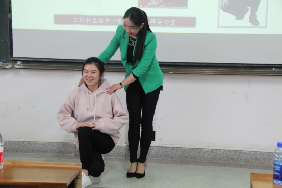 接下来,高老师就以第一印象的重要性为切入口,为我们详细阐释了职场礼仪的具体内容。具体包括恰当的着装,整洁大方的妆容,以及合乎职场礼仪的言行举止。值得一提的是,在讲到后面的恰当的举止时,高老师特地请了几个同学上台互动,活跃了气氛的同时也令同学们亲身体会了如何举止妥当。