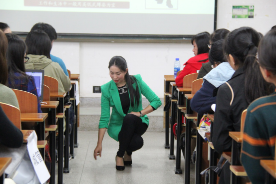 本次活动由著名的礼仪培训师高洁老师主讲,高洁老师博闻强识,见识广博,她用自己的亲身的经历和她在职场上的所见所闻,给同学们带来了一场别开生面、妙趣横生同时令人受益匪浅的职场礼仪讲座。首先。在讲座正式开始前,高老师先跟同学们玩了一个运用手指数数的小游戏,既带动了现场的气氛,更重要的是,告诉了同学们要“时刻准备着”,正如在面试时我们要时刻准备好面对各种各样的问题。