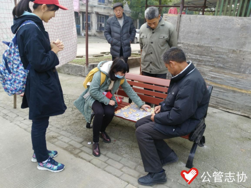 一开始,活动进行的并不顺利,由于一些突发的状况,志愿者没有借到合适的活动室,但志愿者并没有沮丧,反而随机应变,在社区的露天场地里开展了一场别样的志愿活动。在社区的场地上志愿者们分组去给老人送水果瓜子,在社区的长凳上志愿者陪老人下棋,聊天。活动中老人们的兴致很高,积极开心的配合志愿者的活动,整个活动过程温馨而和谐。在离开社区之前志愿者还与社区的一个小朋友拍了合照,他们的脸上都洋溢着愉悦的笑容,那是一种发自内心的快乐。