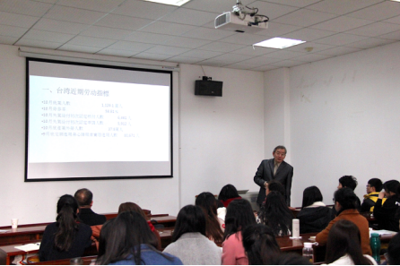 2016年12月10日上午,劳动与社会保障百家讲坛第十五期学术讲座在文泉楼北208室顺利举行。台湾中国文化大学谢棋楠教授作为主讲嘉宾进行了题为“台湾近期劳动政策与行政难题”的演讲。本次讲座由劳动关系本科专业负责人王长城教授主持。武汉科技大学人文社会科学处处长张智勇教授、我校公共管理学院李波教授、熊卫副教授、黄宏伟老师,以及财政税务学院庞凤喜教授等出席了本次讲座交流,来自劳动关系专业和劳动与社会保障专业的部分本科生,以及劳动关系、劳动经济、社会保障等专业的部分硕士生参加了本次讲座。
