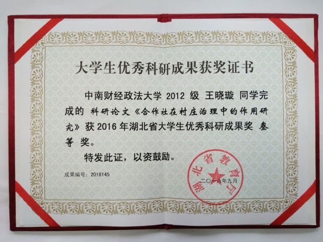 大学生优秀科研成果评选的基本程序是个人填表申报,先经学院推荐和学校筛选,评选出该年度校级优秀科研成果奖;再由 学校统一推荐参与湖北省优秀科研成果评选,整个申报和评选过程时间不长,但功夫主要在平时。我一共参与了两次评选,分别提交了《异地高考改革中的利益冲突及其成因分析》和《合作社在村庄治理中的作用研究》两篇学术论文(下文简称为“异地高考”和“合作社”),这两篇论文都是在李云新老师的指导下完成的。“异地高考”这篇是我本科写的第一篇相对规范的学术论文,从论文选题、构思、修改直至最终成文的各个环节,我都和李老师进行了充分的交流和沟通。为了使文章观点更加客观、可靠,我还阅读了大量相关文献、多方收集并整理数据、政策文本等。后来,这篇文章发表于《理论观察》,并获得2015年校本科生科研成果二等奖。“万事开头难”,非常庆幸自己的第一篇论文能够得到李老师的指导,或许正是这次的写作经历,自己对学术的兴趣开始生根萌芽。