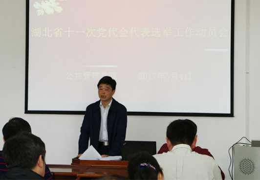 为深入学习贯彻省委高校工委关于省第十一次党代会代表选举工作有关文件精神,2017年5月4日14时15分,公共管理学院在文泉楼北208会议室召开了湖北省第十一次党代会代表选举工作动员会。学院全体教职工党员参加了会议。