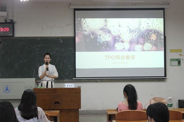 在第一环节,郭老师首先阐释了何为TPO着装,即衣着考虑time(时间)、place(地点)与occasion(场合)三个要素,之后郭老师针对女性介绍了在职业场合、约会场合、休闲场合与社交场合的穿搭及注意细节,又针对男性在商务场合、休闲场合与社交场合的衣着做出细致的指导。图文并茂的PPT与郭老师落落大方的解说加深了我们对职场礼仪的认识与了解,实用的建议也让同学们受益颇多。