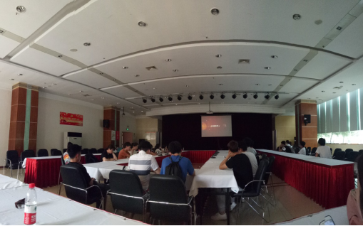 同学们在多功能报告厅观看百步亭社区宣传视频