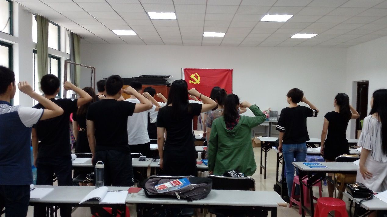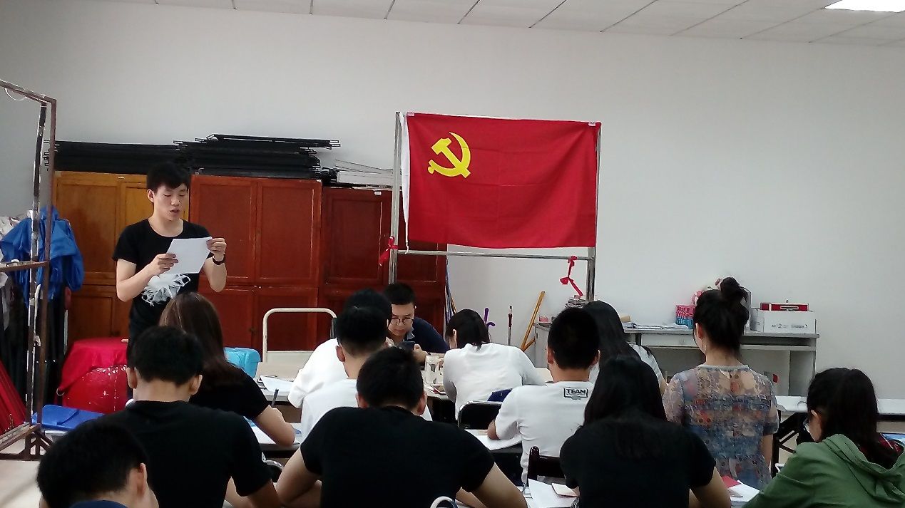 活动在庄严的国歌中拉开序幕,学生党支部书记李尚楠老师率全体党员在鲜红的党旗面前再次庄严承诺,重温入党誓词。随后李绪莹同志带领大家学习《中国共产党章程》第一章党员部分,号召大家要履行党员基本义务,遵守党员基本准则。接下来由新老党员代表分别发言,讲述自己的入党历程和入党后应当承担的责任义务;新党员代表汪雯慧同志提到要虚心向前辈学习,大学生党员在新时代应发挥党员的先锋模范作用;老党员代表吴炜堃同志提到要开拓创新,求真务实,时时刻刻要记住党员身份。在新老党员代表发言完毕后,支部书记李老师谈及自己的入党心路历程,他谈到在大学期间帮助他人的故事,在生活中力所能及的做一些对他人,对社会有帮助的事,并以此来激励大家要做到吃苦在前,享受在后,乐于奉献。