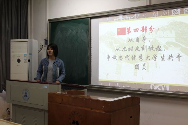 团课开始,主讲人孙悦带领三名新团员宣读入党誓词,然后以“正确方向、坚定信念、永不停息的脚步”为主题,从“明确党团关系,以党为向导,与团共前行”、“倾听习近平总书记教诲,认清自身青年身份,争做优秀团员”、“找准榜样,激励自己不断进步”、“从自身、从此时此刻做起,争做当代优秀大学生共青团员”和“新的时代,新的使命”五个方面讲述了十九大中习近平总书记提出的重要思想以及新时代对当代共青团员的要求。