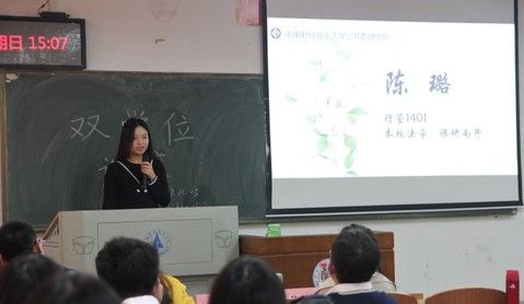 讲座开始,首先由高元作讲解。高元详细地向同学们解释了双学位的概念,展示了修双学位的途径以及报名流程,并就大学生现实学习情况以及未来就业情况列举出修双学位的优缺点,让同学们对双学位有了初步了解。叶洪则主要向同学们展示了自己在学习双学位课程时的一些经历与体会,让同学们真切地感受到修双学位的优缺点。陈璐从自己学习双学位课程的原因说起,依次讲述自己在学习课程的不同阶段所表现出的状态,表达了自己对修双学位的个人见解。修读了外校双学位的张玉梅则对在本校修双学位与在外校修双学位进行对比,详细介绍了华科这所高校的基本情况与华科英语专业的现实状况,并与大家分享了自己在华科学习期间的生活经历以及体会,让同学们初步了解就读外校双学位的情况。