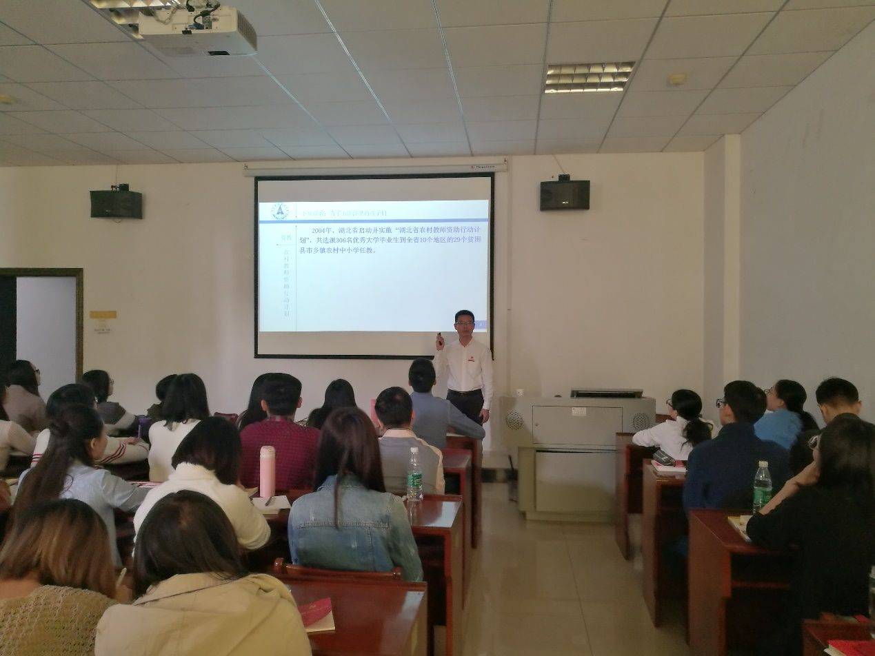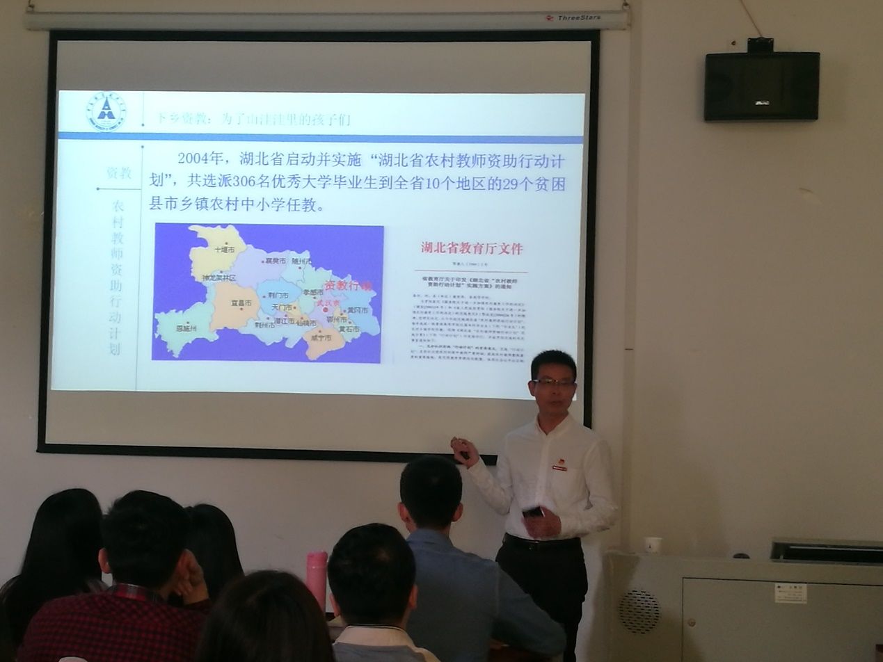 范书记首先跟学员们讲述了自己下乡资教的经历。在2004年,范献龙老师积极响应湖北省教育厅“农村教师资助行动计划”号召,来到了神农架林区下谷中心学校资教。怀着毕业时的满腔热情和对社会的奉献之心,范老师来到了这条件艰苦的地方,从一开始在讲台上紧张、不知所措,到认真准备、刻苦钻研之后的适应教学,范老师用自己的努力成为了学校中的优秀教师。范老师在工作时特别关爱贫困学生,在他的倡导下,几个教师用自己微薄的工资设立了下谷中心学校“资教生助学奖学金”,奖励并资助当地的留守学生、贫困学生近万元。范老师和学员们分享了当时他收到的一个小女生的一封信,学员们深切地感受到,范老师在当地对孩子们的爱以及为孩子们付出的心血,这种奉献精神值得每位学员去学习。