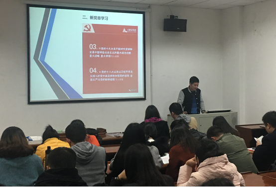 班会活动上,首先由党支部书记带领大家学习和理解党的十九大重要内容,尤其对“新党章的修改”这一部分作了详细讲解,指出中国共产党以马克思列宁主义、毛泽东思想、邓小平理论、“三个代表”重要思想和科学发展观作为自己的行动指南,把科学发展观写在我们党的旗帜上,列入党的指导思想。