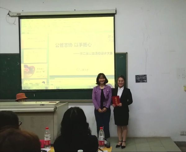 最后,主持人公布成绩,并由各院主席依次为获得优秀奖、三等奖、二等奖和一等奖的班级颁发证书。本次比赛,公管1701、行管1701、劳动1701、公管1601获得优秀奖,劳保1701、城管1601、行管1601获得三等奖,城管1701、劳动1601获得二等奖,劳保1601获得一等奖。至此,本次公益活动设计大赛圆满结束。