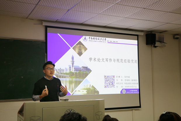 接下来上台发言的是2016级社会医学与卫生事业管理专业的幸超同学,他主要通过讲解相关文件和根据个人经历,来向大家说明学业奖学金、国家奖学金的评审规则以及奖学金的系统申报流程和注意事项,为大家准备奖学金申请提供了帮助和经验。之后,2016级行政管理专业的张阿城同学则主要向大家交流了学术研究的生活和经验,主要内容包括学术论文写作与规范、论文投稿、学术会议参与和研创课题以及其他一些学术心得等,这对于新生认识并进行学术研究起到了积极作用。