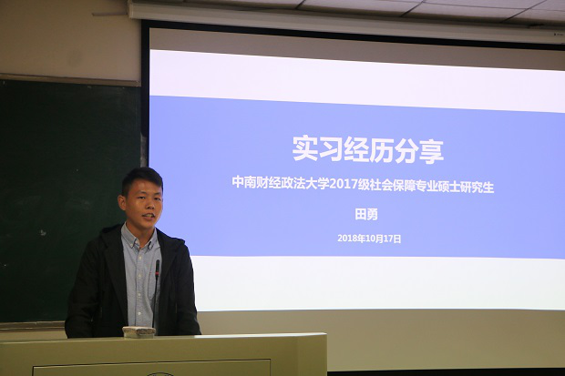 第四位上台发言的是2017级组织与人力资源管理专业的王晓芸同学,该同学主要为大家分享了读研期间如何协调好学习、实习和生活的关系,为大家传授了积极有用的方法和技巧,如目标导向、经常性总结和思考以及学会感恩等等。最后2017级社会保障专业的田勇同学为新生分享了自己的实习经验和感悟,主要包括如何确定自己的目标、实习生活心得、实习原因及收获等等,并为大家提供了一些提高个人工作能力的经验和建议。