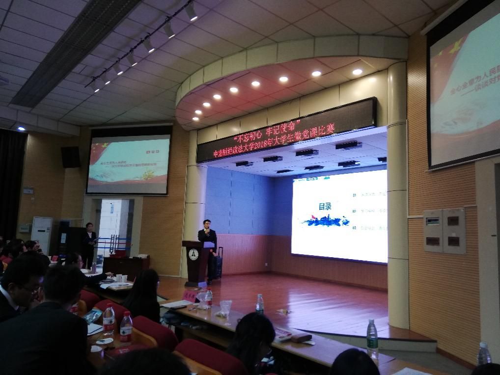 随后,比赛正式开始,来自各学院的28名选手按照顺序上台进行微党课讲授,讲授主题为赛前所抽取的题目。来自我院本科2015级党支部的张坤同学第22个上台,他的微党课主题是《不忘初心,坚持全心全意为人民服务》。从“渊源深远,内涵丰富”“学习榜样,传承发扬”以及“历史使命,青年担当”等三个方面阐述了他对党的根本宗旨的理解与体悟。张坤同学从党的宗旨的渊源和历史引入,进一步阐述了全心全意为人民服务的政治内涵和道德意蕴,由焦裕禄同志和汉川市杨林沟镇党委书记曾国红的事例号召大家从榜样身上汲取精神力量,并在结尾呼吁学生党员同志们接好党的事业的接力棒,做到坚定理想信念、提升个人本领、不断矢志奋斗。