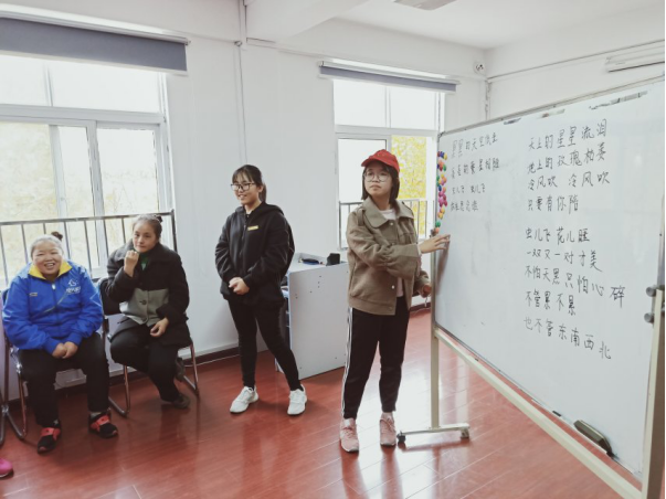 2018年11月22日星期四,参与这次志愿活动的7位志愿者们在首义校区集合,一同前往公交车站乘坐公交车到达硚口区四新社区韩家墩街阳光家园。因为是第一次和他们见面,志愿者先进行了自我介绍,然后给他们表演了节目,演唱了《虫儿飞》。之后一名同学进行教学,另一名同学在黑板上抄写歌词,其他志愿者辅助歌曲教学。在教学过程中,志愿者会邀请主动愿意上前唱歌的孩子演唱。全部歌曲教授完成后,进行了歌曲接龙游戏,孩子们按照座位一人一句演唱,接不上歌词的人表演节目。在最后,志愿者和孩子们一同演唱了《虫儿飞》,这次志愿活动也圆满结束。