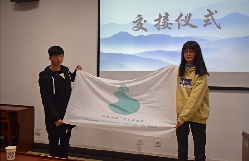 讲座结束后,闭幕式正式开始。首先,大家通过视频回顾了这个月以来的学术交流活动。自开幕以来,秉承“溯本思源,携手共进”的精神,各院学子畅论学术,心怀天下,在专业基础、科研创新方面取得了显著进步,充分体现了我校师生勤学善思、勇于实践、乐于创新的学术精神。最后,在老师、同学们的见证下,公共管理学院学术部将“思源共进”旗帜交接给了下一任主办方财政税务学院学术部代表。
