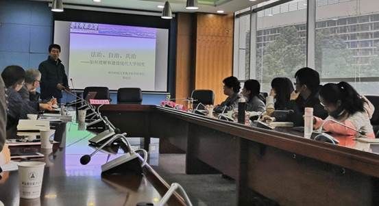 (供稿人李程)2018年12月3日10:00-11:30,以“法制、自制、共制——如何理解和建设现代大学制度”为主题的论坛在中原楼308顺利举行。本期论坛邀请华中科技大学教育科学研究院副院长陈廷柱教授担任主讲人,公共管理学院徐双敏教授担任主持人,出席讲座的有档案馆校史馆馆长徐警武教授、社科院汪锋副院长、信息管理部古勇副部长、发展规划处郭华侨和黄容霞副研究员、行政管理系教育经济与管理教研室主任魏萍副教授、文澜学院魏山老师、公共管理学院邓光平副教授等及公共管理学院部分研究生。