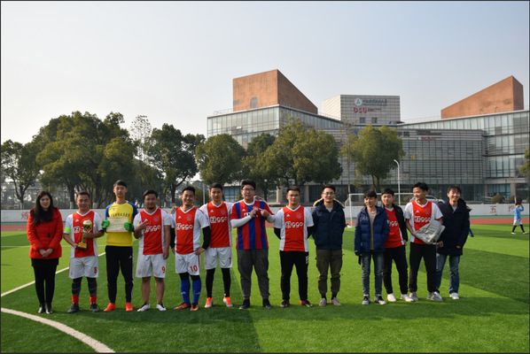 下半场比赛结束,城管、保关各进一球。最终城管1501代表队以总分4:1战胜保关联队,一举夺得本次足球赛的第一名。赛后,主持人进行颁奖仪式,队员们与李荔老师合影留念。