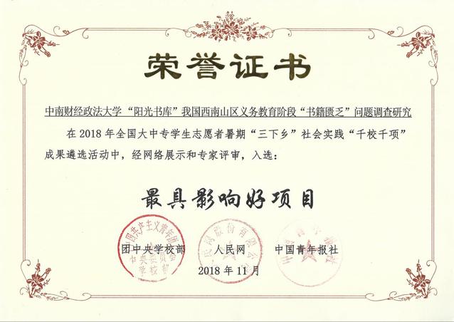 新闻网讯(通讯员王阳)近日,由团中央学校部、中国青年报社、人民网共同主办的2018年全国大中专学生志愿者暑期“三下乡”社会实践“千校千项”成果遴选活动中,我校公共管理学院“阳光书库”暑期社会实践团队经过作品申报、资格筛选、网络投票、专家评审等环节,从1万余申报团队中脱颖而出,最终荣获全国“最具影响好项目”荣誉称号。