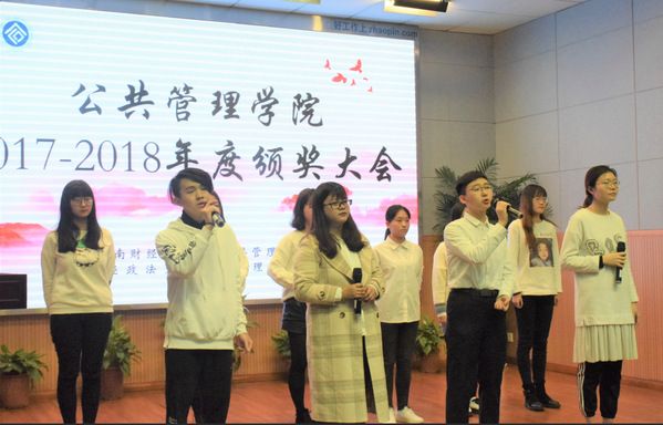 新闻网讯(学生记者 罗曦 摄影 刘璟宜)光阴荏苒、岁月如梭,2018年即将过去,总结过去的一年,公共管理学院硕果累累,涌现出了众多优秀学生与团体。为表彰他们取得的优异成绩,我院于12月21日晚7点半在南湖校区文潭楼一楼报告厅举行2017-2018年度颁奖大会。莅临本次颁奖大会的嘉宾有公共管理学院党委书记雷照荣、公共管理学院院长丁士军、党委副书记龚家友、副院长邓汉慧、副院长张广科、团委书记兼2016级本科生辅导员李荔、学办主任兼2017级本科生辅导员黄勤以及2015级本科生辅导员王阳。