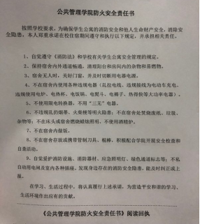 (通讯员:郝泽乾)近年来,校园火灾事件时有发生,为了保护同学们的校园生活安全,加强同学们对火灾危害的认识,公共管理学院对在校研究生进行了今冬明春火灾防控知识的普及以及寝室检查的工作,由每班选取2名安全员对寝室进行安全排查,向大家普及火灾防控的知识,树立危机意识,并组织各班同学签订了《防火安全责任书》。