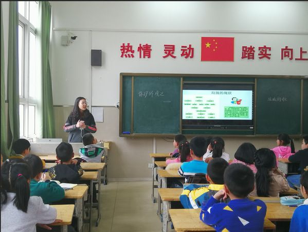 当小老师讨论如何处理垃圾时,有的小朋友提议将垃圾二次利用做成生活用品,有的小朋友认为应该将垃圾烧掉或埋掉。志愿者与学生们一起思考、分享想法,仿佛此时没有年龄之分,大家都一起思考如何使我们的家园更加美好。在问答过程中,同学们的齐声回答快速而准确,可见大家对垃圾回收都有了更深刻的认识。讲课尾声,老师播放了一个记录垃圾回收过程的纪录片,虽然不及动画片生动有趣,但学生们仍看得津津有味,并相互讨论观点,有的同学还上讲台向志愿者提问。不知不觉一节课就在欢声笑语中悄悄溜走,下课后,志愿者们依依不舍地与学生们告别,本次环教活动结束了。