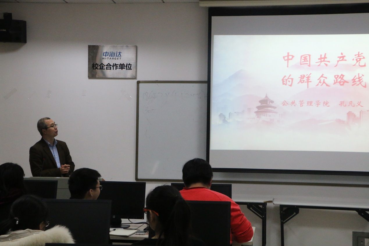 接下来的党课培训由孔凡义副教授为培训班学员们讲述“中国共产党的群众路线”。孔老师从“什么是党的群众路线”、“如何认识党的群众路线”、“群众路线的历史”和“如何践行党的群众路线”等四方面向大家强调了了解党的群众路线的重要性,期间孔老师多次引用精准扶贫这一政府中心任务辅助讲解,通过理论联系实际,使得同学们对群众路线的理解和认识更加深刻。