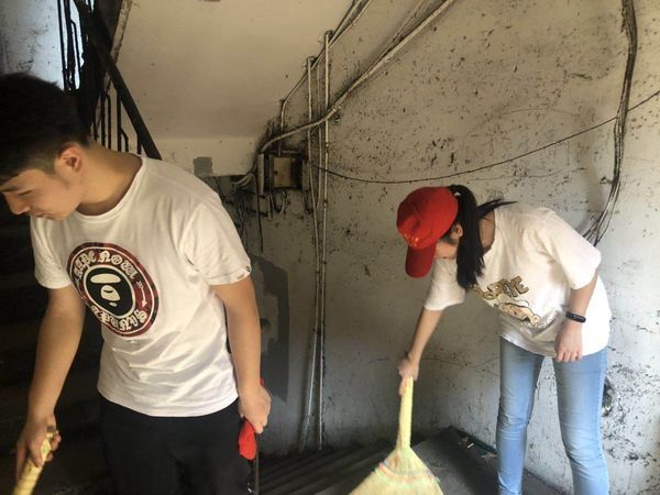 烈日炎炎下志愿者们准时到达济利社区,然后社区的志愿负责人带领志愿者们前往居民楼。志愿者们今天的主要任务就是打扫楼梯间卫生,大家戴上志愿小红帽,拿起扫把和铲子,便积极投入了劳动中。从楼顶顺着楼梯一路往下清扫,虽然大型的垃圾不多,但仔细一瞧,四处散落的烟头、一次性筷子的包装袋、被撕下的小广告……没过多久便把铲子填满。这些生活中不起眼的小垃圾,积少成多变成了污染环境的罪魁祸首。