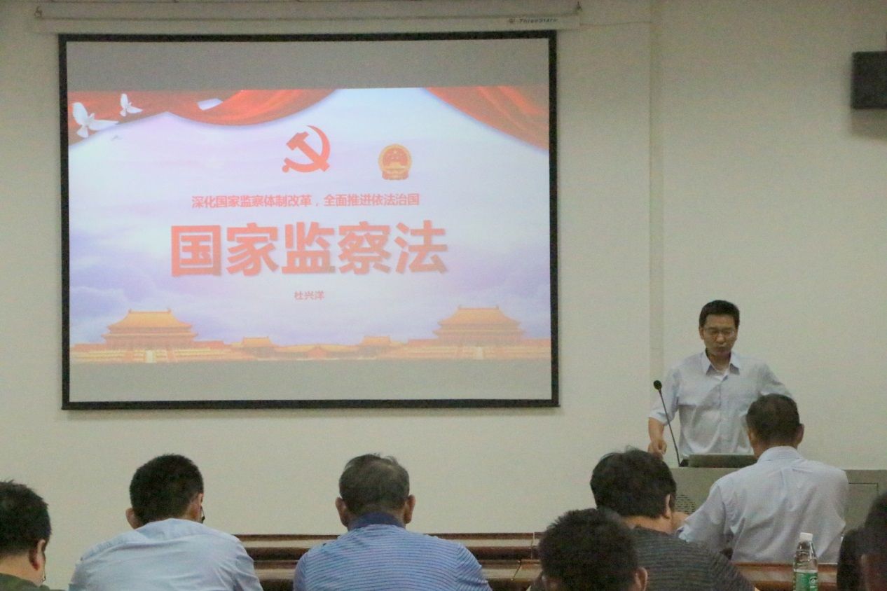 最后,MPA教育中心主任杜兴洋为全体教职工开展党课警示教育,党课以“深化国家监察体制改革,全面推进依法治国”为主题,主要从国家监察法的监察组成、监察职责、监察职权、监察程序四个方面的内容进行学习。通过学习,全体教职工对国家监察法有了初步的了解,大家在今后的工作中将增强法治反腐意识,廉洁自律,正确履行自己工作职责。